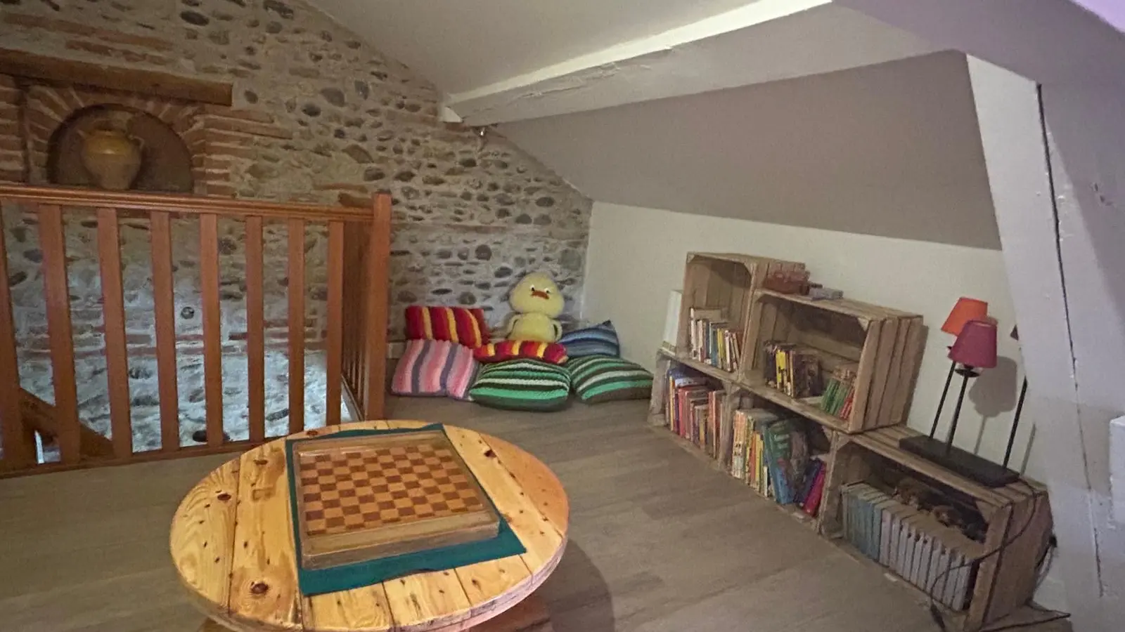Ground floor: 1 living room with access to 1 terrace and where 1 staircase leads to a mezzanine with 1 sleeping area (1 x 140cm bed, 1 x 90cm bed), 1 kitchen (fitted units, LV, MO, LL, fireplace), with access to another terrace and the vegetable garden, 1 bedroom (1 x 140cm bed), 1 bathroom (shower, bath), 1 wc. Upstairs: 2 bedrooms (1 double bed), 1 reading area, 1 wc with washbasin. Outside: 2 garden furniture sets, barbecue, "La Garonne" 200 m away for fishing. Covered carport. Heat pump heating. Free WiFi. Optional: end-of-stay cleaning, sheet hire, household linen.