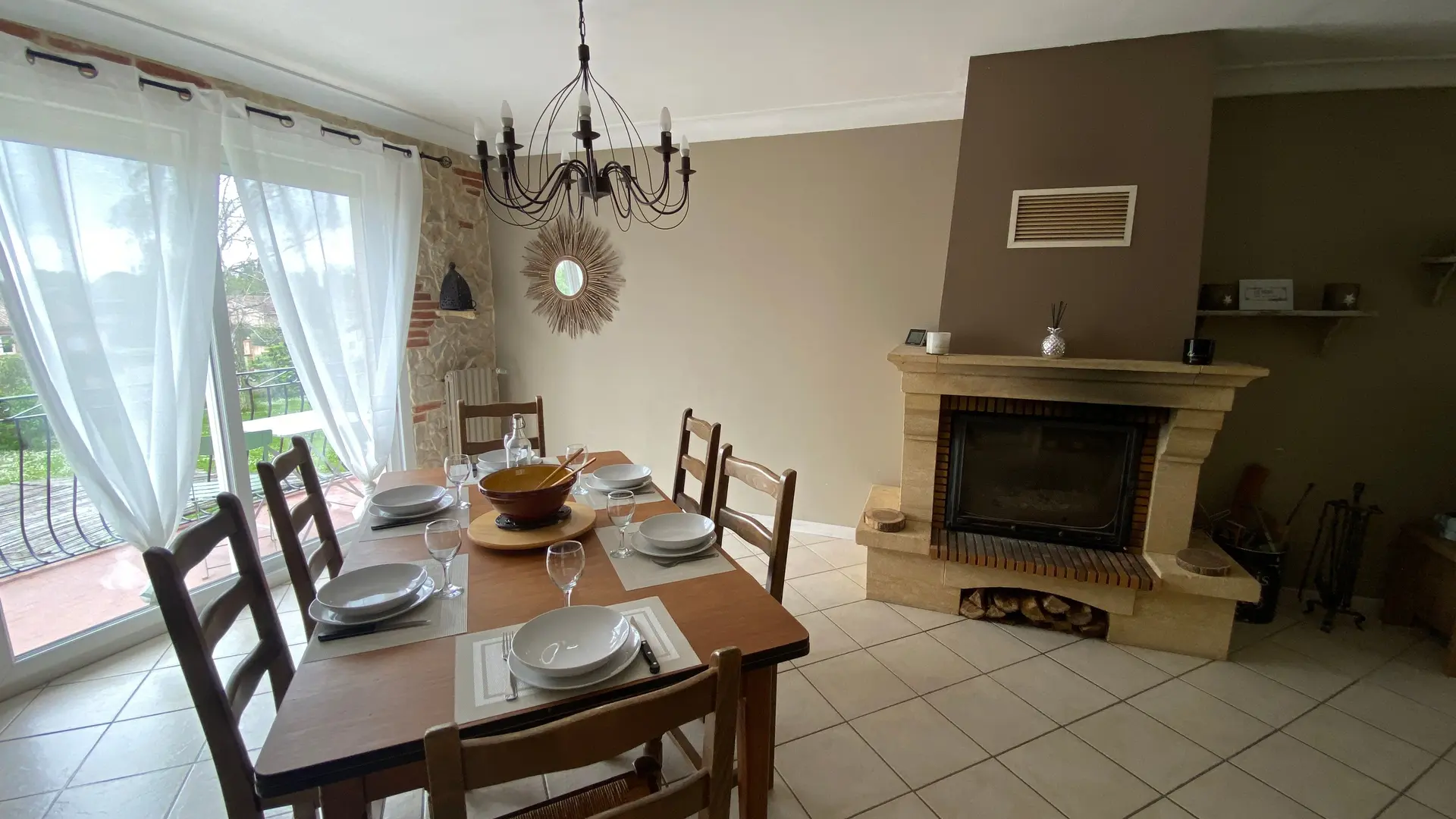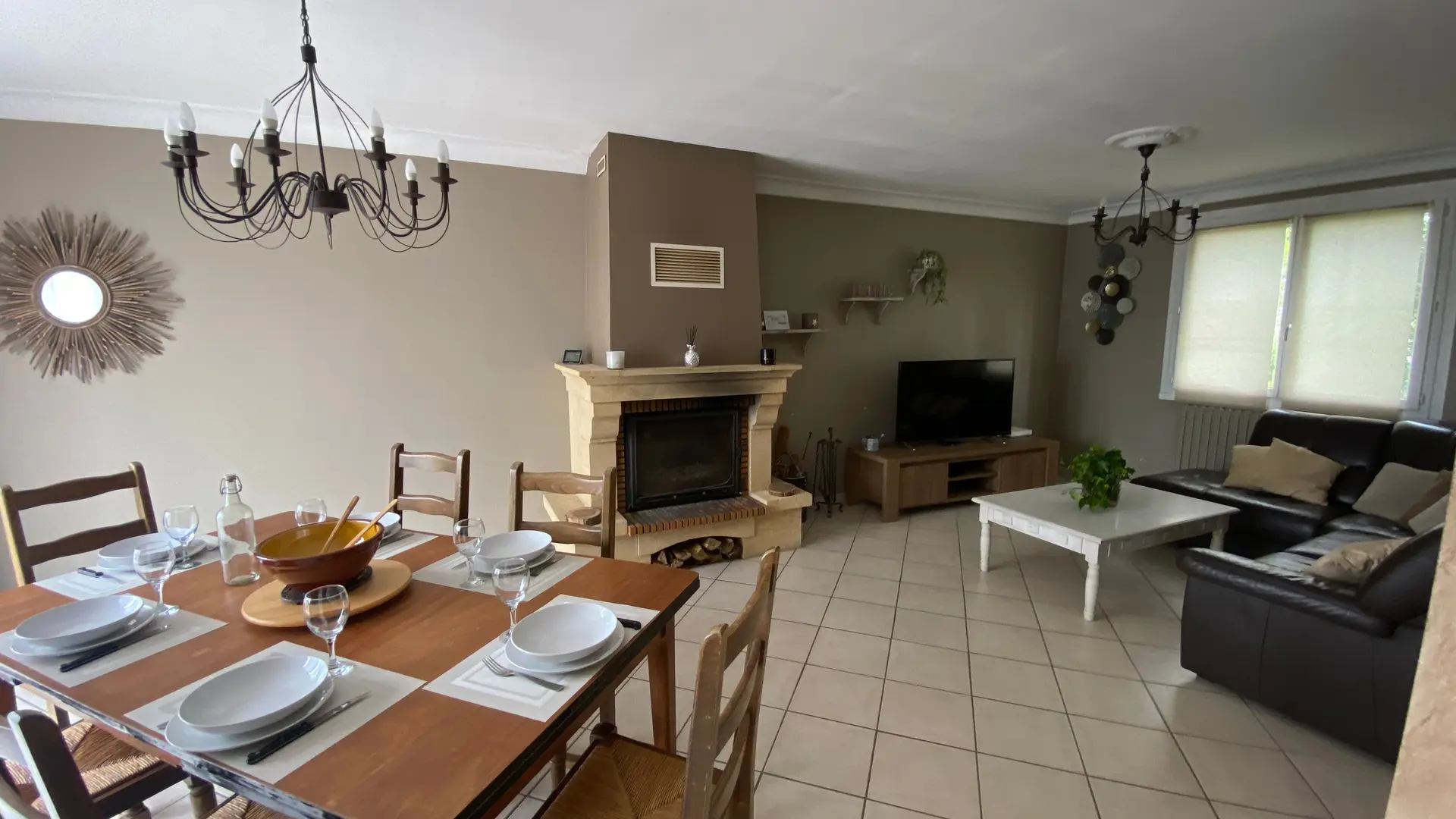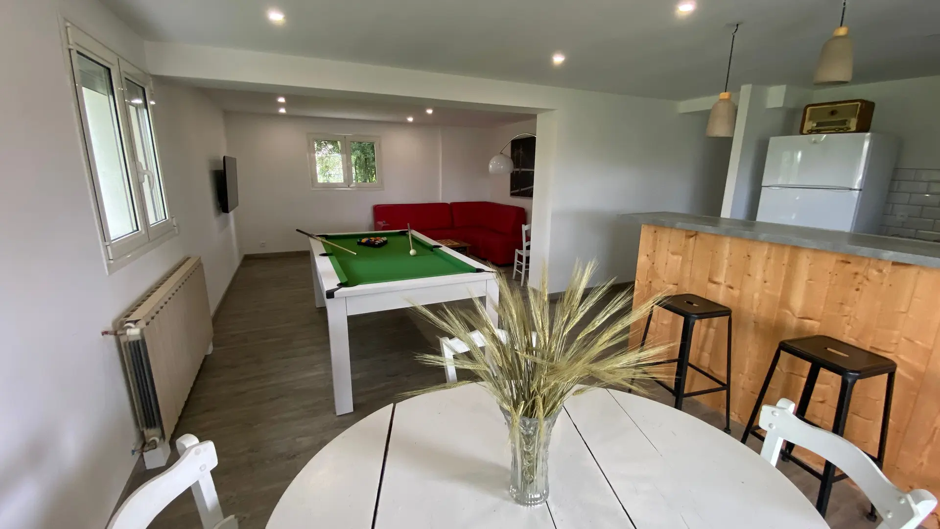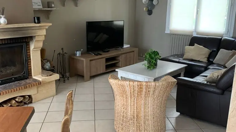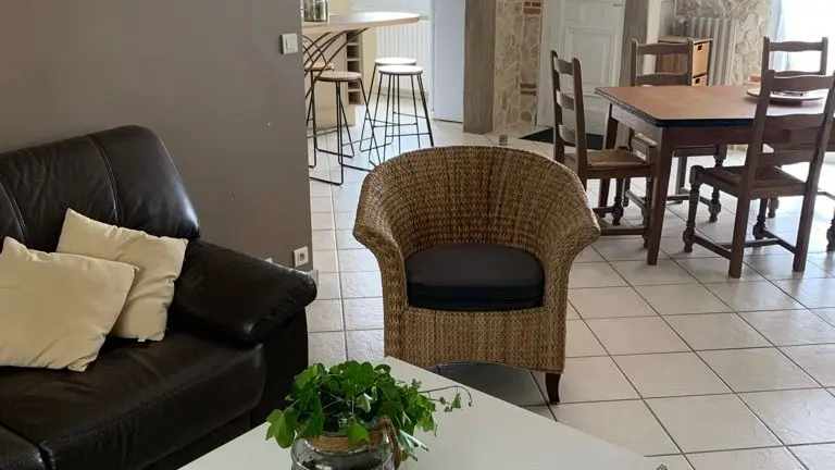 The accommodation comprises two interconnected areas, on the ground and ground floors, with all modern comforts. On the ground floor, there is a living room with a fitted kitchen (fridge-freezer, hob, oven, washing machine), table and chairs, corner sofa and TV. A bedroom (2 x 0.90cm beds), a bedroom (1 x 140cm bed) and a huge shower room with wc. Via an internal staircase and another external staircase, the 1st floor offers a large living room with fireplace (TV insert), corner sofa, dining area (table and chairs), and integrated kitchen area (cooking facilities, dishwasher, oven, microwave, fridge). Two bedrooms (2 single beds), one bedroom (1 double bed), shower room and separate wc. Balcony on first floor. Covered pergola with garden table and stools, string lights. Wifi throughout. Bed linen, towels and household linen provided and included in the price. Wood for the fireplace provided. Charcoal barbecue. Fenced garden with trees and gate. Bicycles can be stored at the rear.