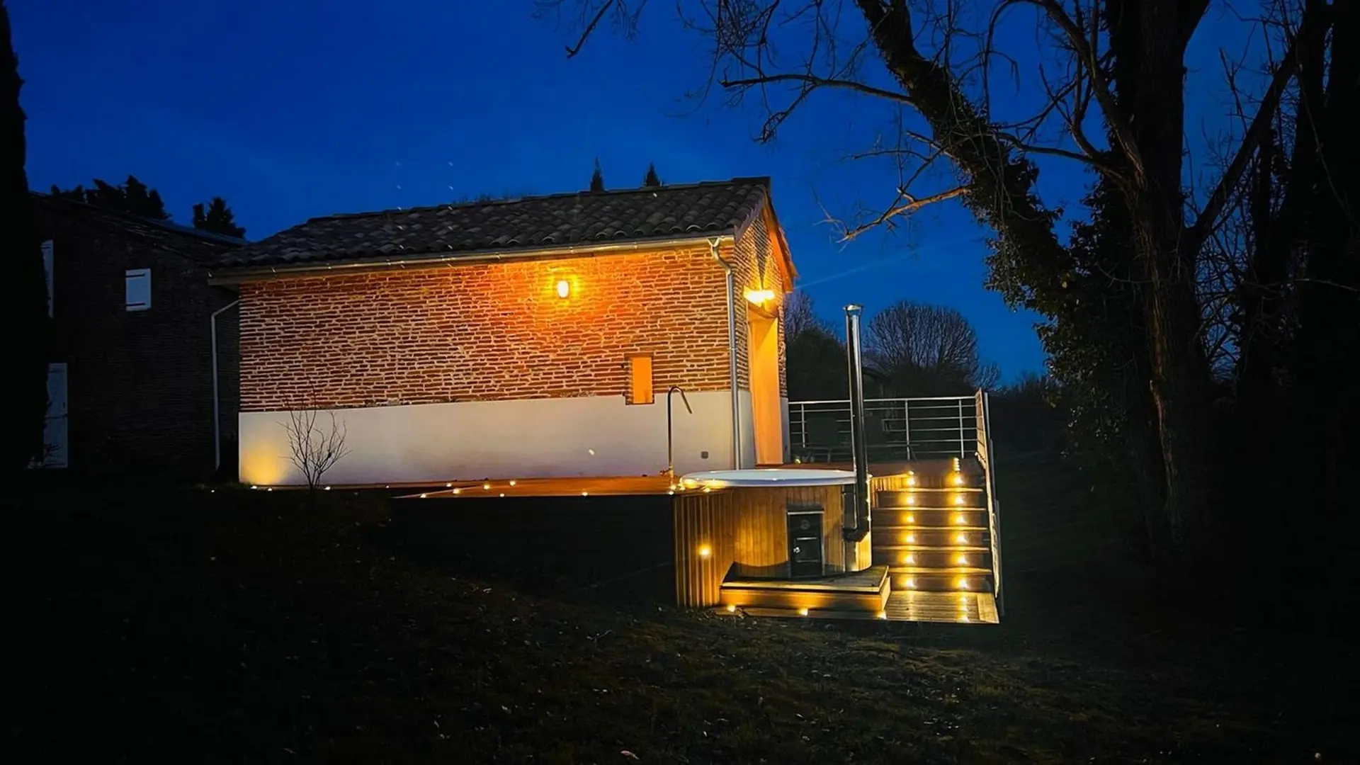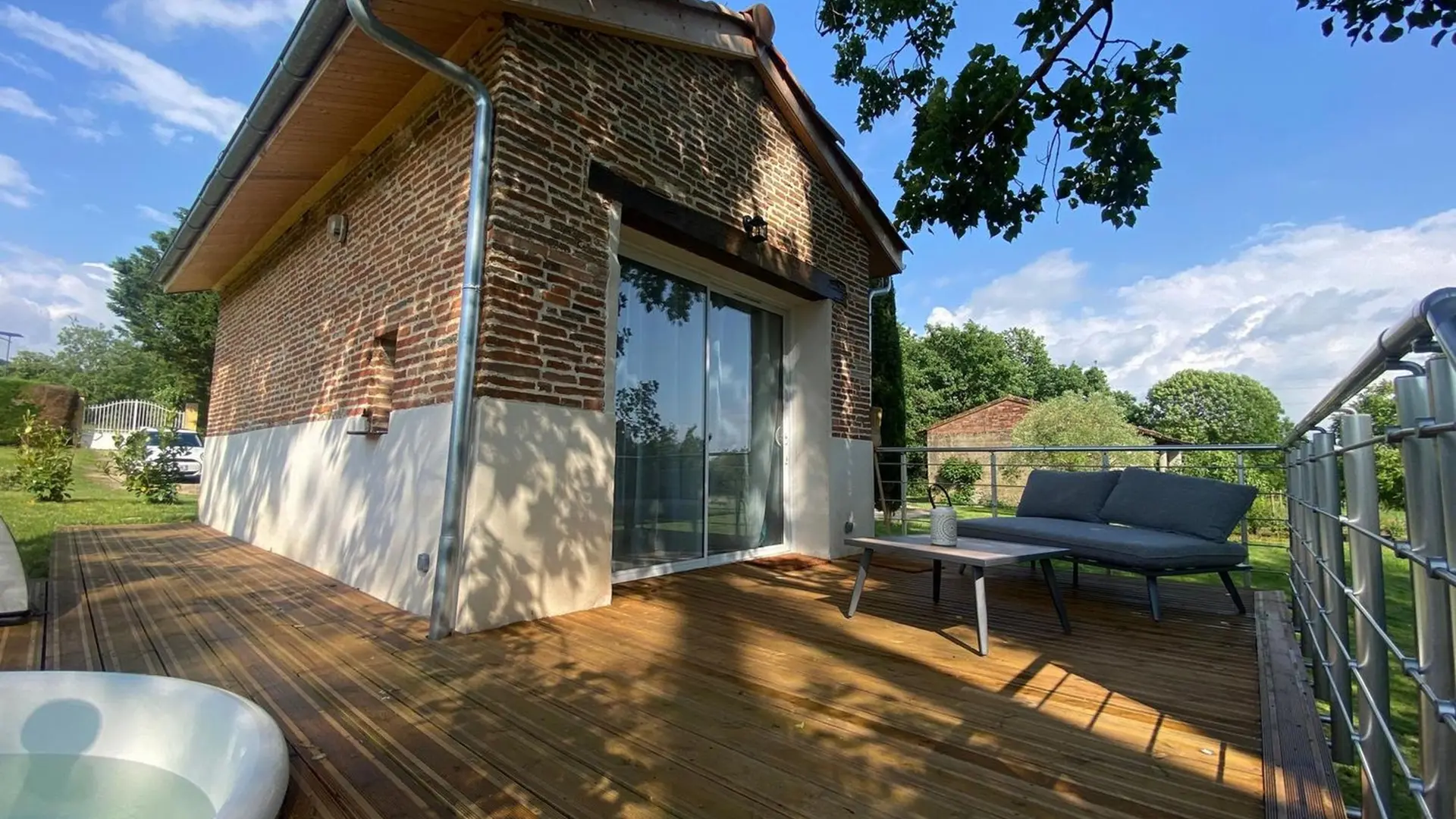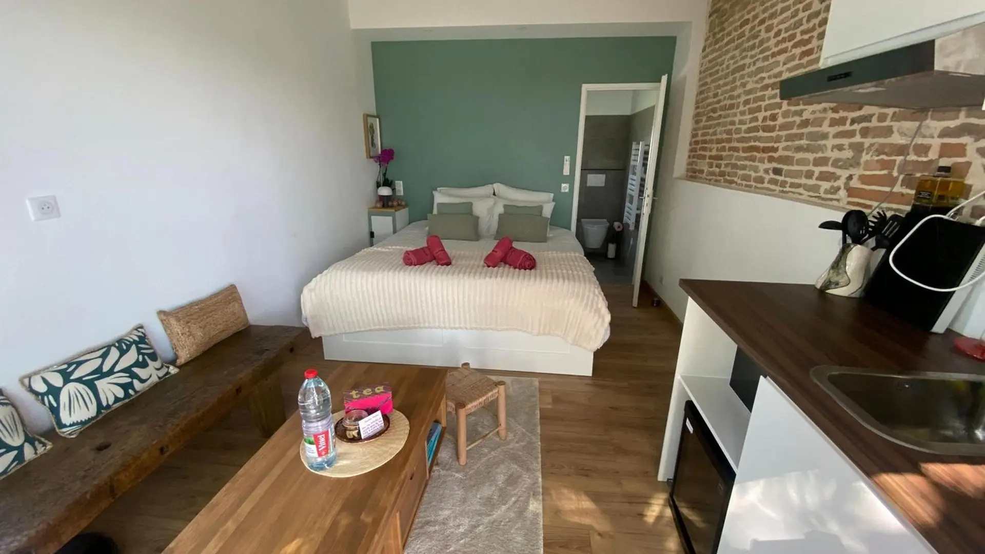 Entre Toulouse et Montauban, proche du canal de Garonne, découvrez le Bétia Cocoon SPA et Sérénité qui comprend une grande chambre avec un coin cuisine bien aménagé et un coin salon dans un intérieur de poutres apparentes et mur de briques.